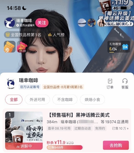 近日,瑞幸咖啡与知名游戏《黑神话:悟空》进行了联名合作,并推出了一款名为“黑神话腾云美式”的联名饮品。这款饮品将于8月19日正式发售。目前,瑞幸官方已在抖音平台开启了直播和预售活动,截止到目前为止,黑神话腾云美式已经销售超过10万份。