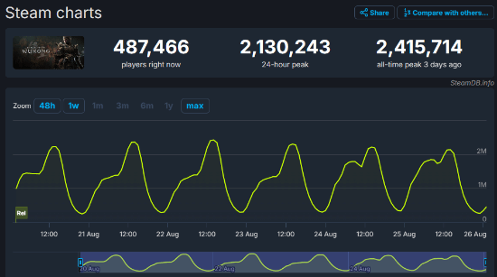 根据SteamDB的数据,《黑神话:悟空》的首个周末在线人数保持稳定,周六和周日的峰值分别为220万和213万,虽然未能打破周四的241万高峰,但也维持了较高的在线人数。