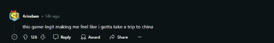 最近,一位粉丝在Reddit社区分享了自己今年早些时候来中国旅游拍摄的照片(似乎包括宁波天童寺的图片)。玩家们对游戏的还原度表示惊讶,他们认为游戏中出现的金佛石像和古塔庙宇等与实际景观如出一辙。甚至有人表示,通过这款游戏,他们突然有了去中国旅游的想法。