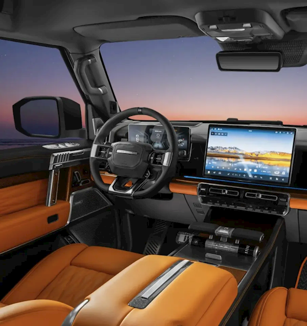 猛士M800星际战车延续了猛士917的布局,配备了悬浮式仪表盘、中控屏和副驾驶屏等配置,并采用曜石黑、星际灰和爱马仕橙的配色方案。新车内部还加入了碳纤维面板、机械按钮中控台、手枪式的车门把手和飞机同款换挡杆等硬派元素。