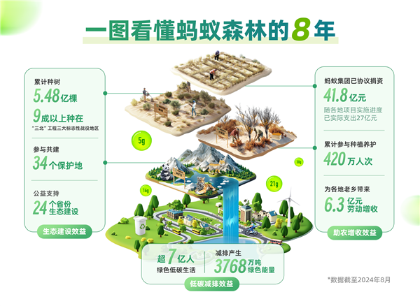 8月27日,蚂蚁集团公布了其生态公益项目“蚂蚁森林”的最新进展。该项目自2016年8月上线支付宝以来,在全国范围内已经种植了5.48亿棵树,其中90%以上的树木种在了“三北”工程的三大标志性战役地区。