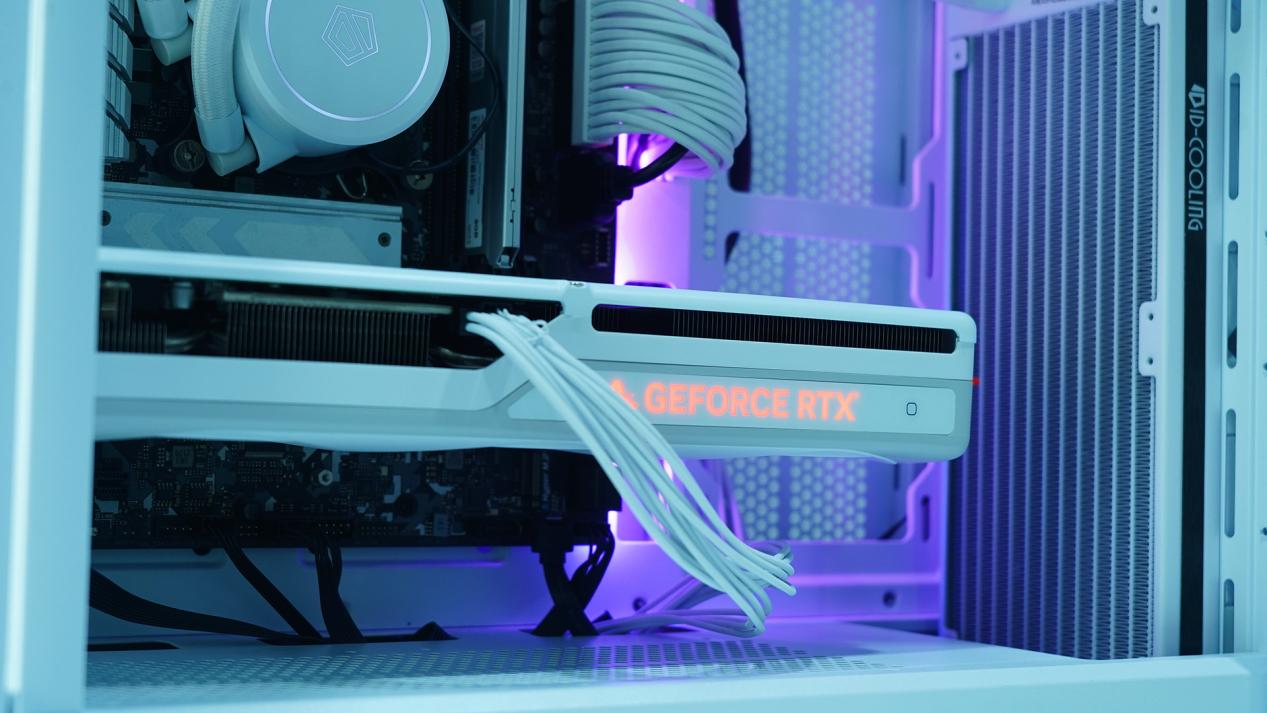 显卡采用9叶9cm环形扇叶设计,三围为325*119*52mm,为2.5插槽设计,侧边装载自主控制的RGBLOGO信仰灯,搭配纯白色的海景房主机绝对出彩。