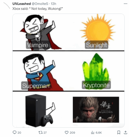 《黑神话:悟空》的PC和PS5版本已经正式推出,然而Xbox版仍然没有动静。有不少玩家在社交媒体上制作了相关的幽默图片来调侃这一情况,将其与吸血鬼拒绝阳光、超人拒绝氪石等经典元素相结合。