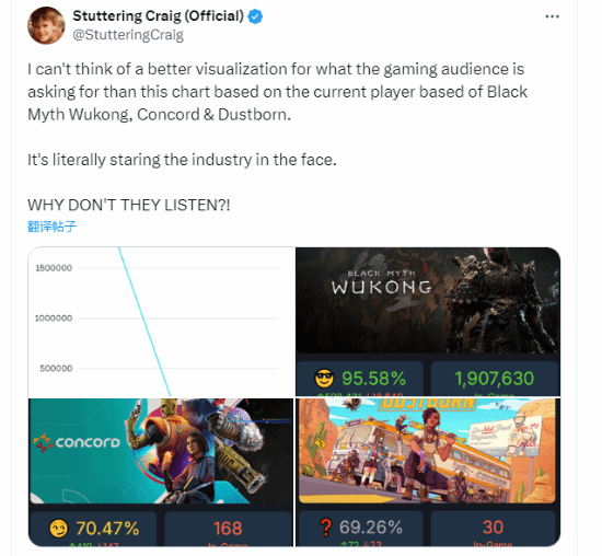 近日,外网博主StutteringCraig对比了三款最新上市的游戏作品:《黑神话:悟空》、《星鸣特攻》和《尘路之旅》。他注意到,在这些游戏中的玩家数据存在着巨大的差距,尤其是后两者,《星鸣特攻》和《尘路之旅》,都拥有着明显的DEI(多玩家在线)元素。