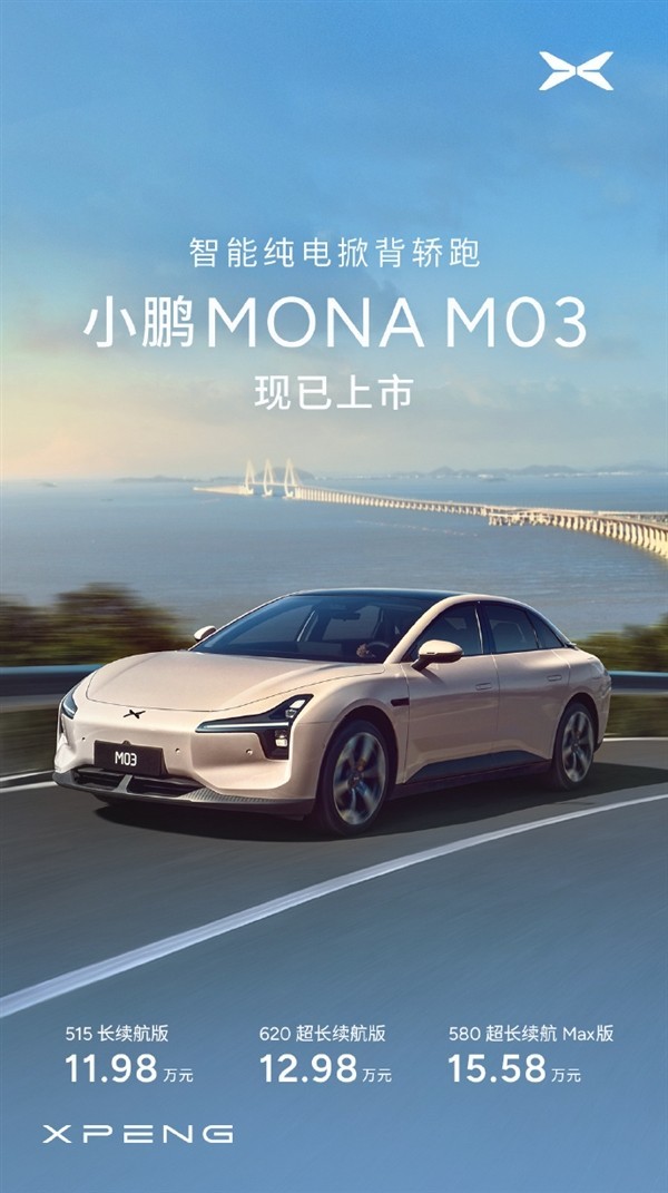 小鹏汽车今晚正式发布了其最新款智能纯电掀背轿跑车型MONA M03。这款车型的起售价仅为11.98万元,堪称具有超高性价比的选择。