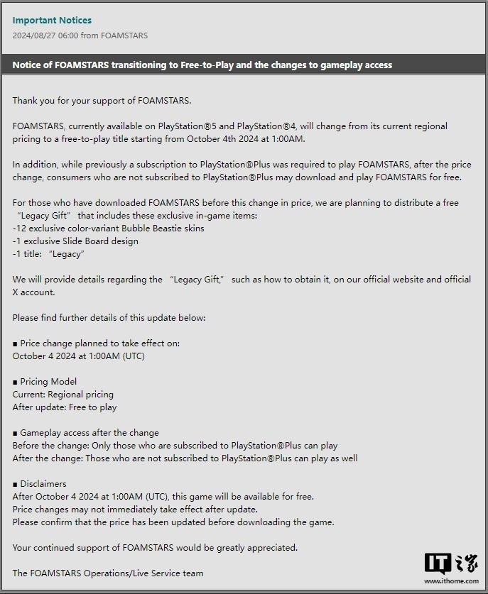 游戏公司Square Enix近日宣布,旗下多人游戏《Foamstars(泡沫之星)》将于10月4日开始免费提供给所有用户。该游戏于今年2月6日在PlayStation商店上架,售价为238港币(约合217元人民币),PS4和PS5的独占游戏。
