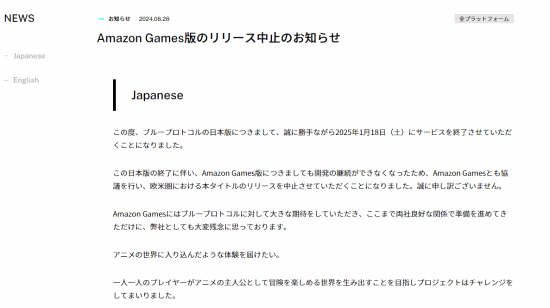 官方表示:“在《蓝色协议》的整个开发过程中,我们与亚马逊游戏一直保持着密切的合作关系,我们双方团队对无法将游戏交付给全球玩家感到失望。”