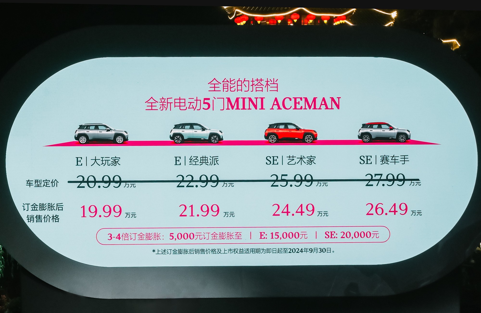 全新电动MINI Aceman充分发扬MINI品牌的创新精神,在仅4米左右的车身长度内采用5门5座全新结构,提升了典型的多功能性,创新设计元素基于经典更显醒目,把多彩生活统统装进车里,适合喜欢在都市丛林里好奇探索的年轻人,或对实用性有更高需求的小家庭。全新电动MINI Aceman同样提供4个车款,分别为大玩家、经典派、艺术家和赛车手,售价相应为19.99万元、21.99万元、24.49万元和26.49万元(此价格为订金膨胀后销售价格,有效期为即日起至2024年9月30日(含))。