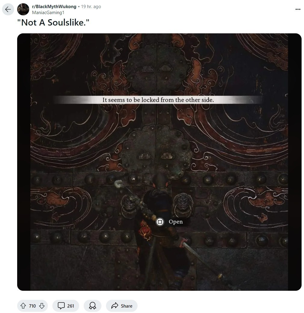 自《黑神话》初次亮相并发行以来,玩家们一直在热议它是否属于魂类游戏。最近,国外玩家发现了一个强有力的证据表明它是此类游戏。Reddit用户以幽默的方式指出,《黑神话》同样有“门不能从这一侧打开”的设定,质疑这难道还不够资格称为魂游吗?随后的评论中,网友也机智地玩起了梗,重复着类似“你没资格啊”这样的FS社魂游猜测。无论是否为魂游,《黑神话》的玩家和喜欢这类游戏的人有一个共同点:他们都热衷于根据游戏体验来推测制作人的意图。现在,《黑神话悟空》的全收集互动地图已经上线,包含了所有NPC支线任务、隐藏地点和重要道具等详细信息!