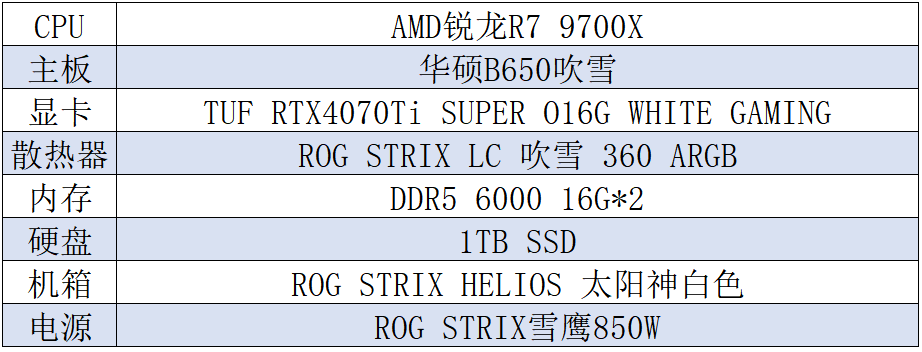 首先为大家推荐一套白色主题的锐龙9000电竞平台。以华硕B650吹雪主板(ROGSTRIX B650-A GAMING WIFI)为核心,搭配AMDR7 9700X处理器、TUFRTX4070Ti SUPER O16G WHITEGAMING显卡等令潮流电竞玩家心动的电竞装备,可高画质顺畅运行各类大作,并带给玩家无与伦比的整机灯效和游戏体验!
