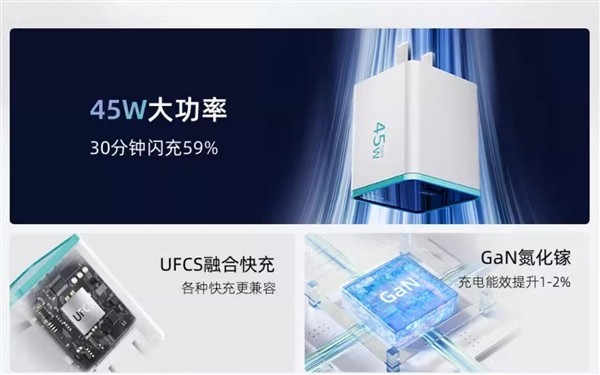 这个充电器具有很多优点。它采用45W功率输出,并且向下兼容,可以快速充电,让你摆脱电量焦虑。此外,它的快充协议通过了UFCS认证,可以兼容支持UFCS协议的华为、vivo、OPPO等设备快充,适用范围更广。