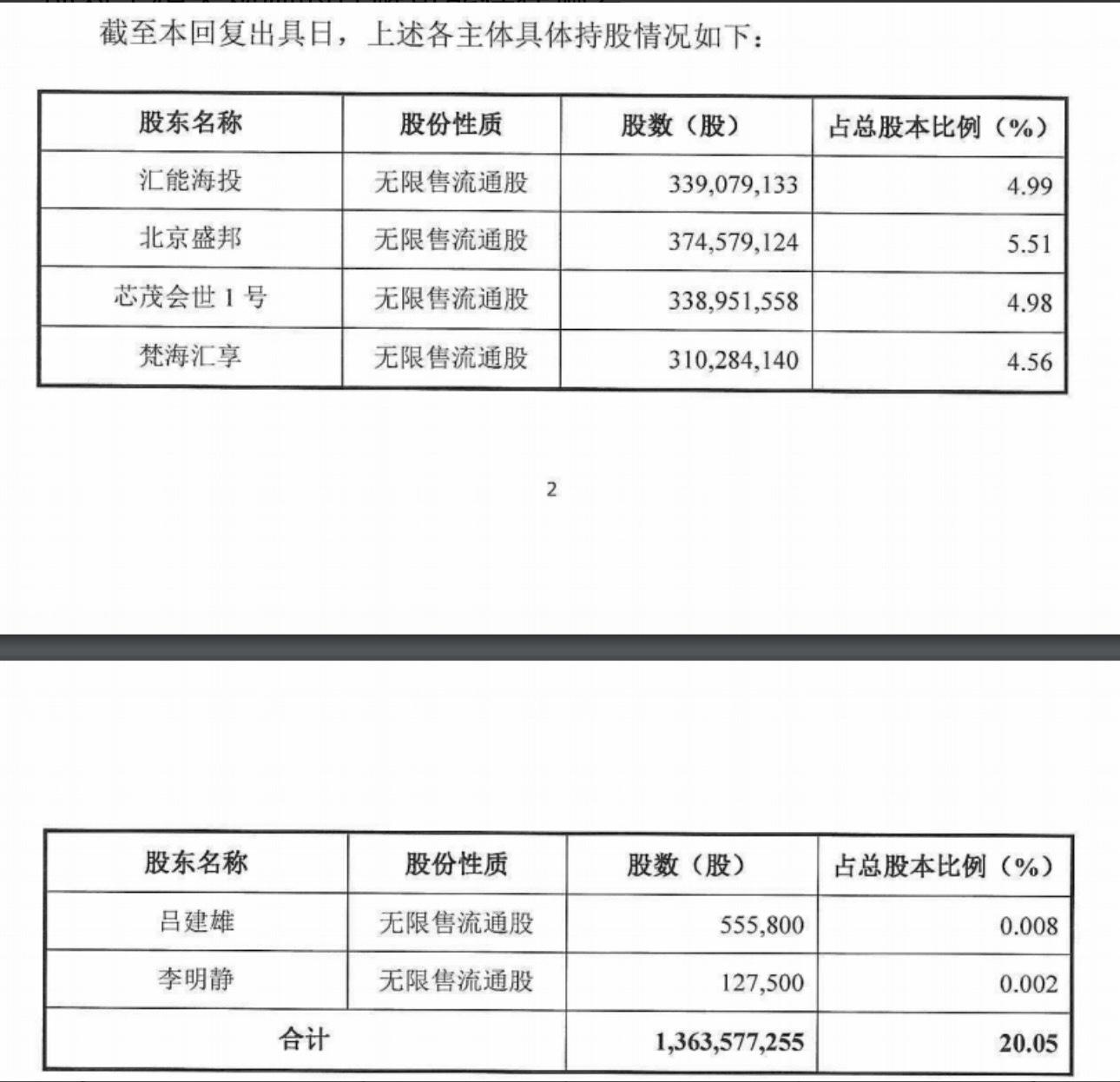 汇能海投在回复监管函中列明,截至回复出具日,四家机构主体与两名自然人共持有ST新潮13.64亿股,占总股本的20.05%。