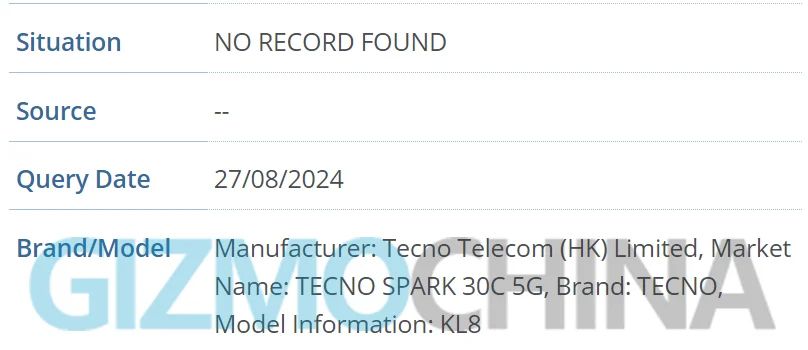 根据IMEI数据库显示的信息,TECNO SPARK 30C 4G的型号为KL5,而TECNO SPARK 30C 5G的型号为KL8。在配置方面,TECNO SPARK 30C 4G配备了720*1600分辨率的屏幕和4800万像素主摄、800万像素辅助摄像头。电池容量达到5000mAh,并首次搭载联发科Helio G81芯片组。