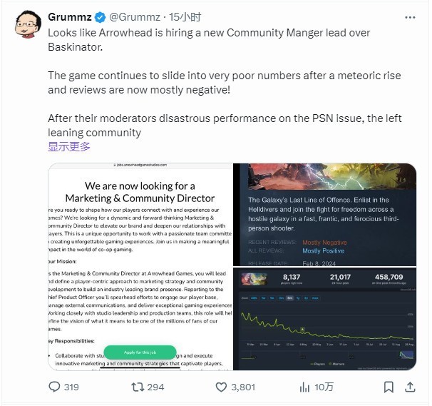 近日,《绝地潜兵2》在Steam上的评价已经由好评转为多半差评,同时玩家数量也持续下滑。开发商Arrowhead正在寻找新的营销兼社区总监来取代目前的社区总监Baskinator。