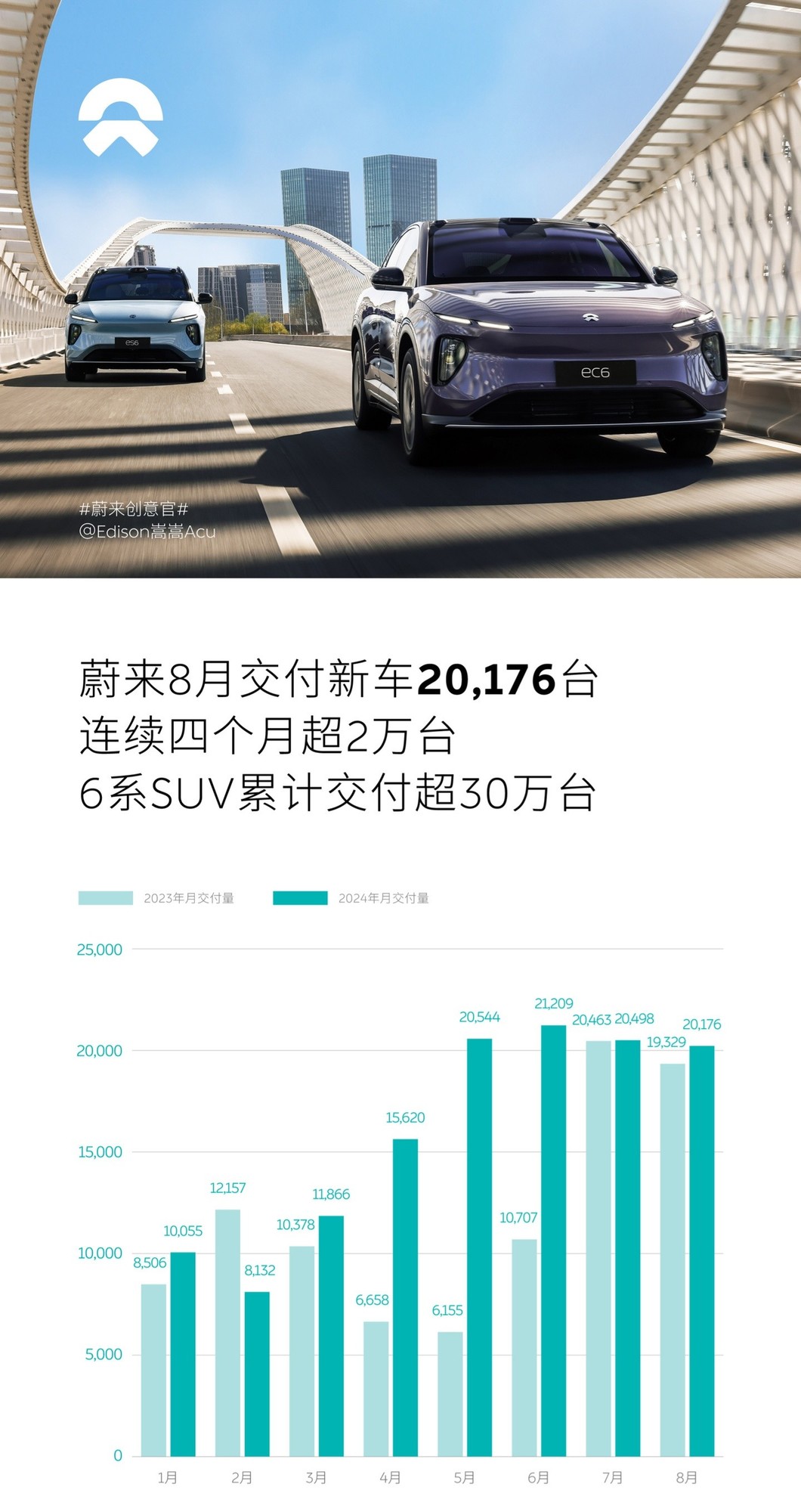 蔚来汽车:8月份交付20176辆,同比增长4.38%