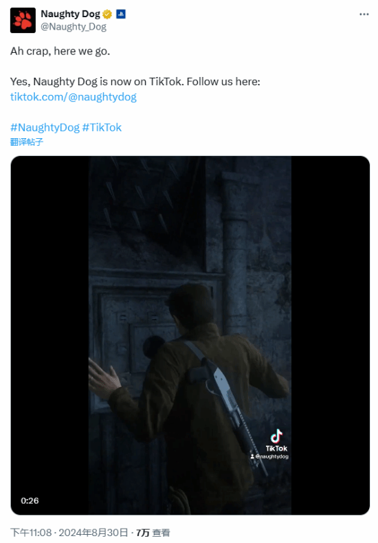 8月30日,知名游戏开发商顽皮狗在社交媒体平台上正式宣布了其入驻TikTok的消息,并表示未来会有更多与该平台合作的活动。同时,许多玩家也在评论区表达了对于新作品的期待。