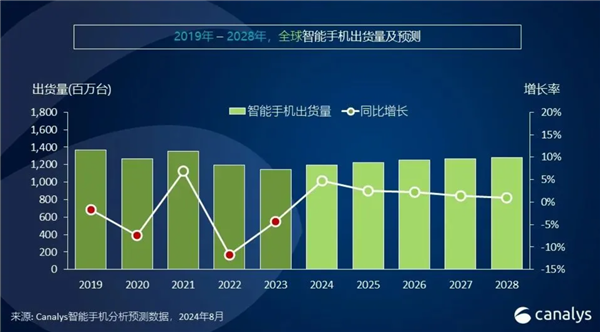 根据市场研究机构Canalys最新发布的报告,预计到2024年全球智能手机出货量将达到12亿台,同比增长5%。尽管面临成本上涨、库存周转和营商环境等挑战,但市场景气度仍稳步提升。