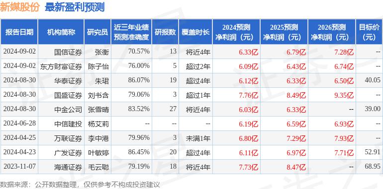 新媒股份2024年中报显示,公司主营收入7.71亿元,同比上升9.16%;归母净利润2.78亿元,同比下降15.58%;扣非净利润2.78亿元,同比下降13.5%;其中2024年第二季度,公司单季度主营收入3.71亿元,同比上升5.97%;单季度归母净利润1.3亿元,同比下降18.14%;单季度扣非净利润1.3亿元,同比下降17.06%;负债率24.99%,投资收益-89.96万元,财务费用-2156.94万元,毛利率50.05%。