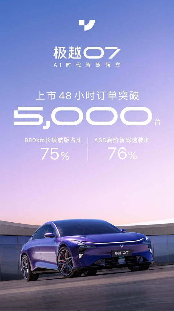 极越07上市48小时订单突破5000台 限时售价19.99万起