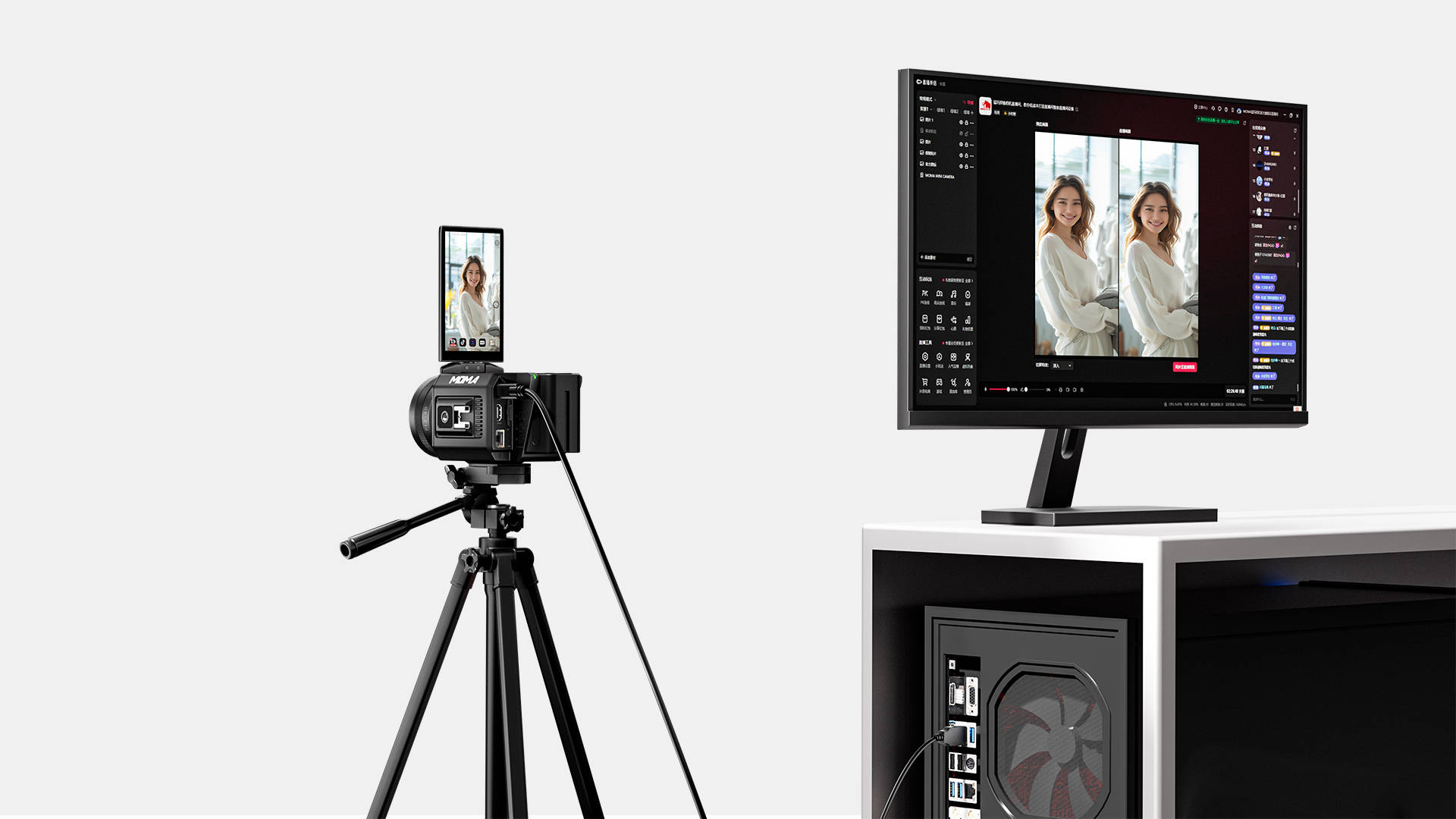 对于相对成熟的直播间,除了直播相机,还需要电脑来实现更丰富的直播功能。使用传统相机,需要配备采集卡、声卡、散热器、拓展坞等等辅助设备,非常繁琐。猛玛探境PRO直播相机,只需一根Type-C线连接拍摄端和电脑端,即可轻松实现UVC高清开播,无需另外购买辅助设备。