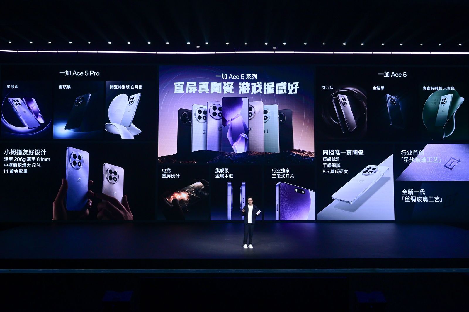 一加Ace5 系列采用全新设计语言,简洁优雅,同时充满性能感。一加Ace5 系列带来六款全新配色,全部采用行业旗舰级工艺打造,搭配专属「AcePerformance」标识,象征一加对游戏体验的极致追求。其中一加Ace5「引力钛」以及一加Ace5 Pro「星穹紫」采用行业首创的「星轨玻璃工艺」,在玻璃上画出万条星轨纹理,带来细腻的整机手感。一加Ace5「天青瓷」以及一加Ace5 Pro「白月瓷」,更是采用同档唯一的陶瓷材质,莫氏硬度达到8.5,手感温润,坚固耐磨。