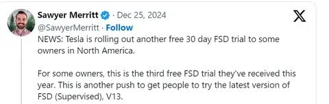 特斯拉在美国和加拿大地区向部分客户推出了为期30天的全自动驾驶(需要人工监督)免费试用计划,这项计划将于明年2月22日前结束。这是特斯拉最新的推广其最新版本全自动驾驶系统(需要人工监督版)的举措。