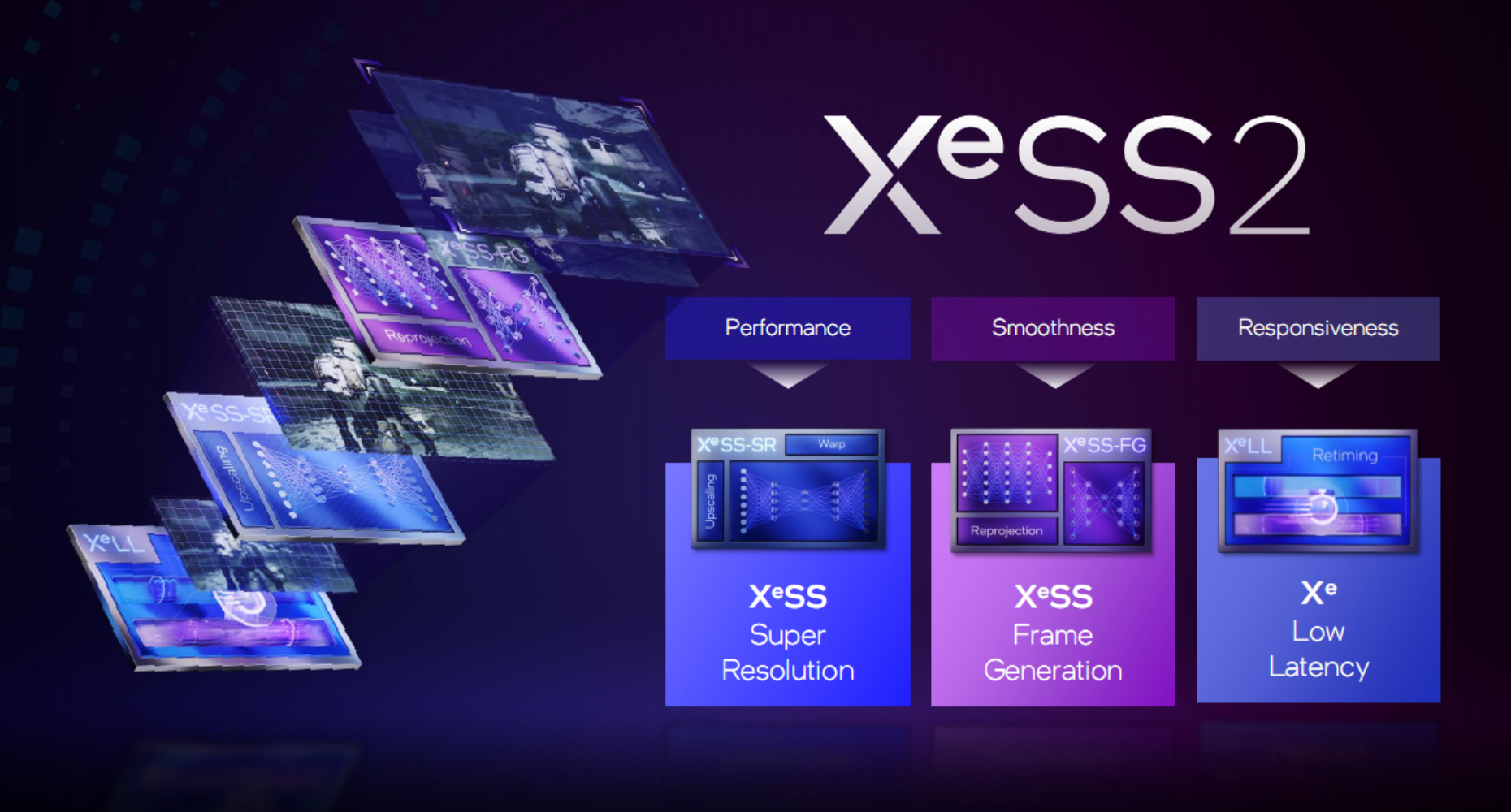 既然说到了intel第二代XeSS技术,这里就简单介绍一下XeSS2,它在XeSSSuper Resolution超分辨率技术的基础上新增了XeSSFrame Generation帧生成技术与XeLow Latency低延迟技术,让玩家能够享受到更高的游戏帧率与更低的操作延迟。