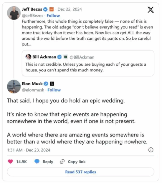 对此,贝佐斯回应说:“整件事都是假的。”他和未婚妻劳伦·桑切斯一直对他们的婚礼计划保密。虽然马斯克也向这位老对手表达了祝福,“即使现在没有婚礼,也希望贝佐斯未来能够举办一场‘史诗般的婚礼’”。他表示,“一个发生惊人事件的世界总比一个什么都没有发生的世界要好。”