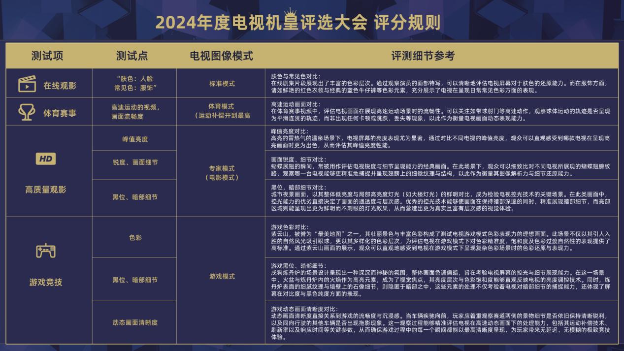 为了确保评价的全面性和准确性,大会还制定了完善的测试项目和打分规则。测试涵盖四大最常见场景:在线观影、高质量观影、体育运动和游戏竞技。测试包括肤色、常见色、运动清晰度、峰值亮度、黑位、暗部细节、运动清晰度、游戏色彩等8个具体项目。