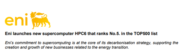据埃尼官网介绍,HPC6位于意大利米兰附近的一个小镇Ferrera Erbognone,这个小镇的人口只有1140人。同时,埃尼声称其数据中心是欧洲最节能的数据中心,并且由1兆瓦的光伏电站供电。本月上旬,在TOP500超算榜中名列第五,前四名分别为El Capitan、Frontier、Aurora以及Eagle。这意味着,HPC6是榜单前五名中唯一座不在美国的超级计算机,也是欧洲目前最强大的超算之一。