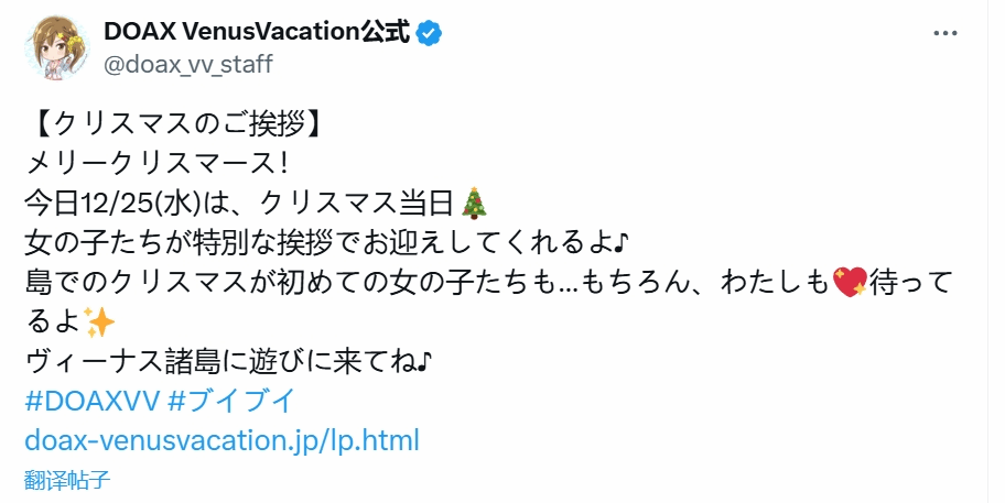 12月25日,官方《死或生:沙滩排球 女神假期》推特送上了圣诞祝福,并分享了女性角色的节日装扮。他们祝愿大家圣诞快乐,特别提到岛上的女孩们会用独特的问候迎接这个节日。对于初次在岛上过圣诞节的人来说,不要错过这次活动,包括开发者在内的团队也在期待大家的到来。推文附带了许多游戏内女性角色穿着迷人圣诞服装的照片,营造出浓厚的节日气氛。