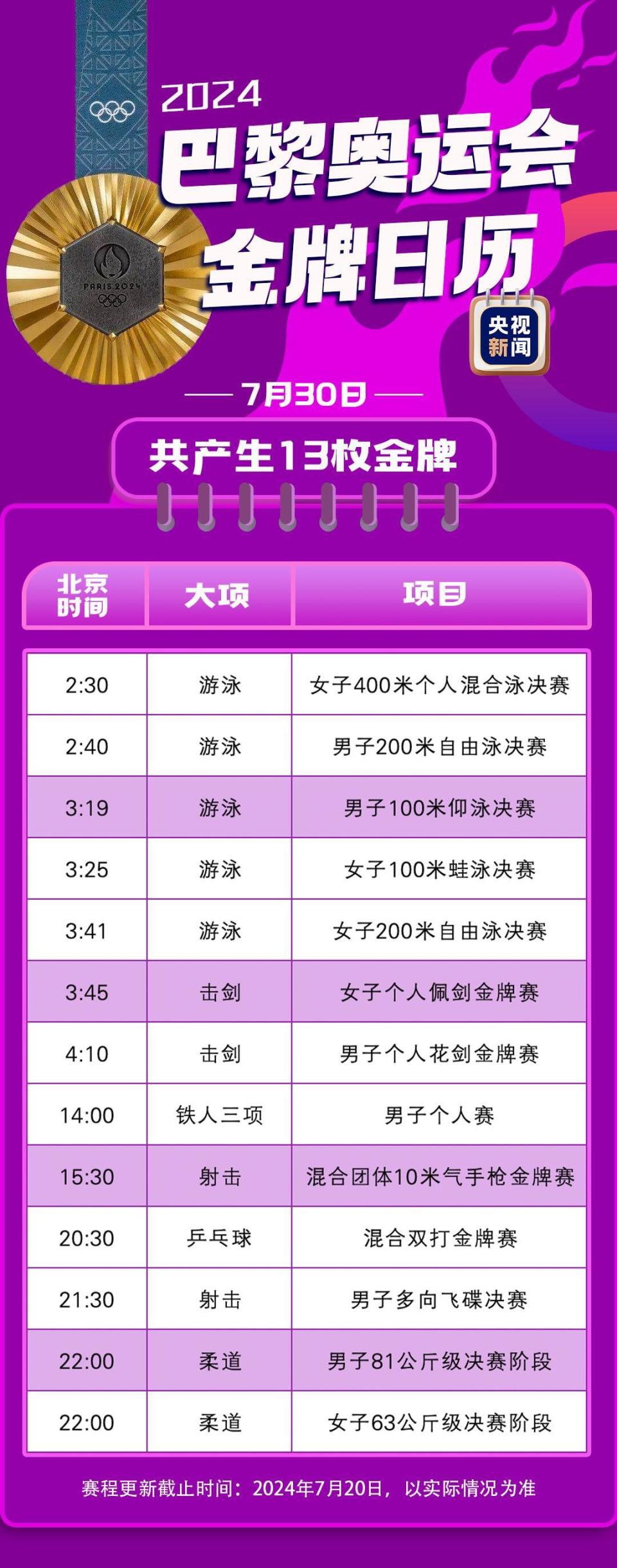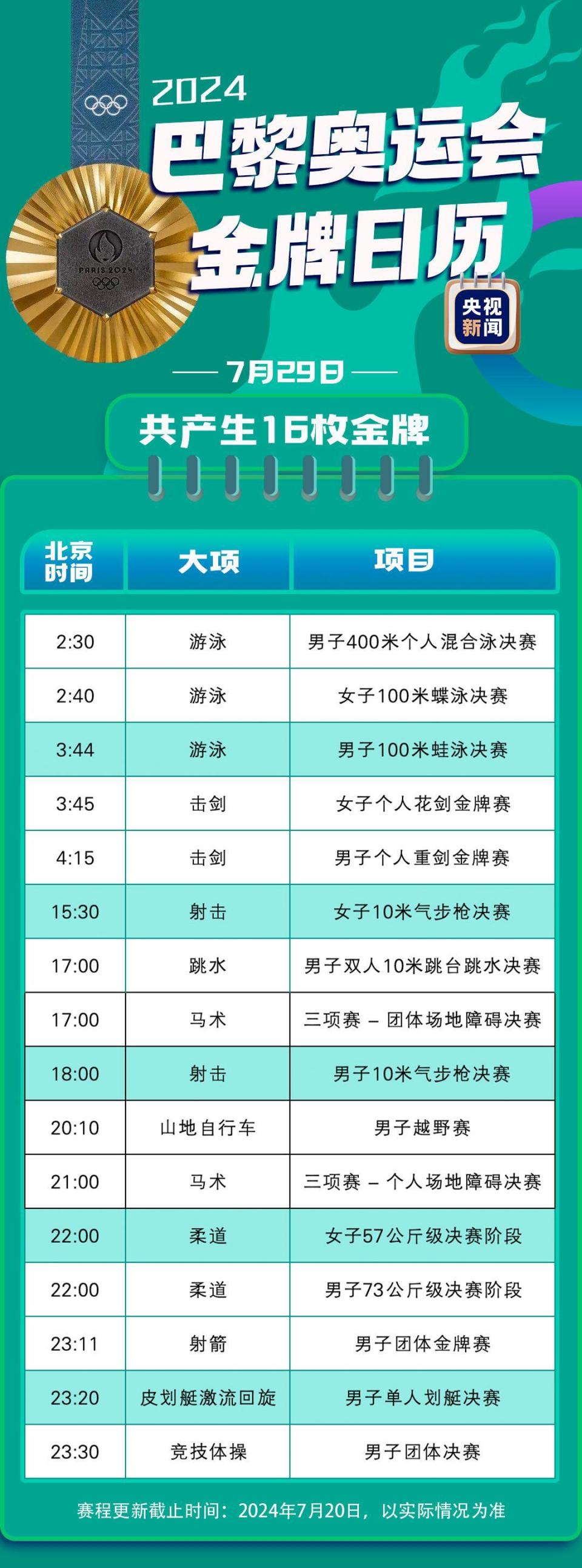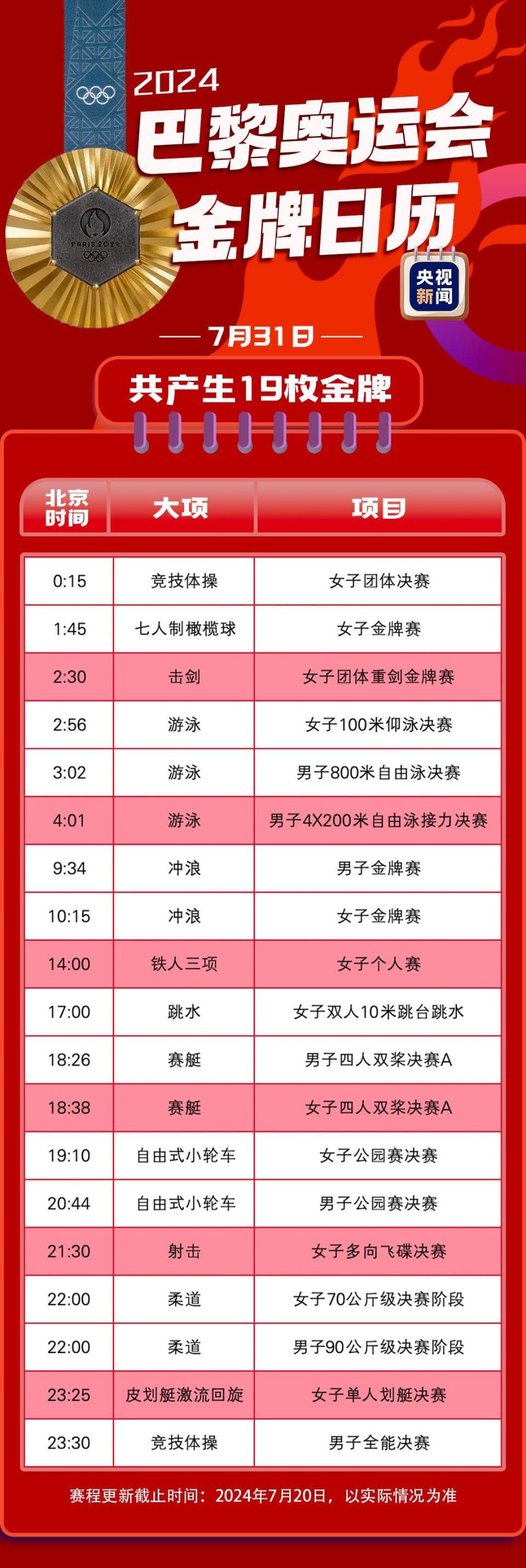 转载:https://new.qq.com/rain/a/20240721A012DM00 2024-07-21 08:00·央视新闻·发布于北京 北京时间7月27日凌晨巴黎奥运会正式拉开帷幕还有不到一周的时间快收藏这份最新金牌观赛日历共同期待精彩的奥运赛事(赛程来源:国际奥委会网站)监制丨陆毅制片人丨房轶婷策划丨杨瑾视觉丨李雪莹编辑丨温焌意 张宁