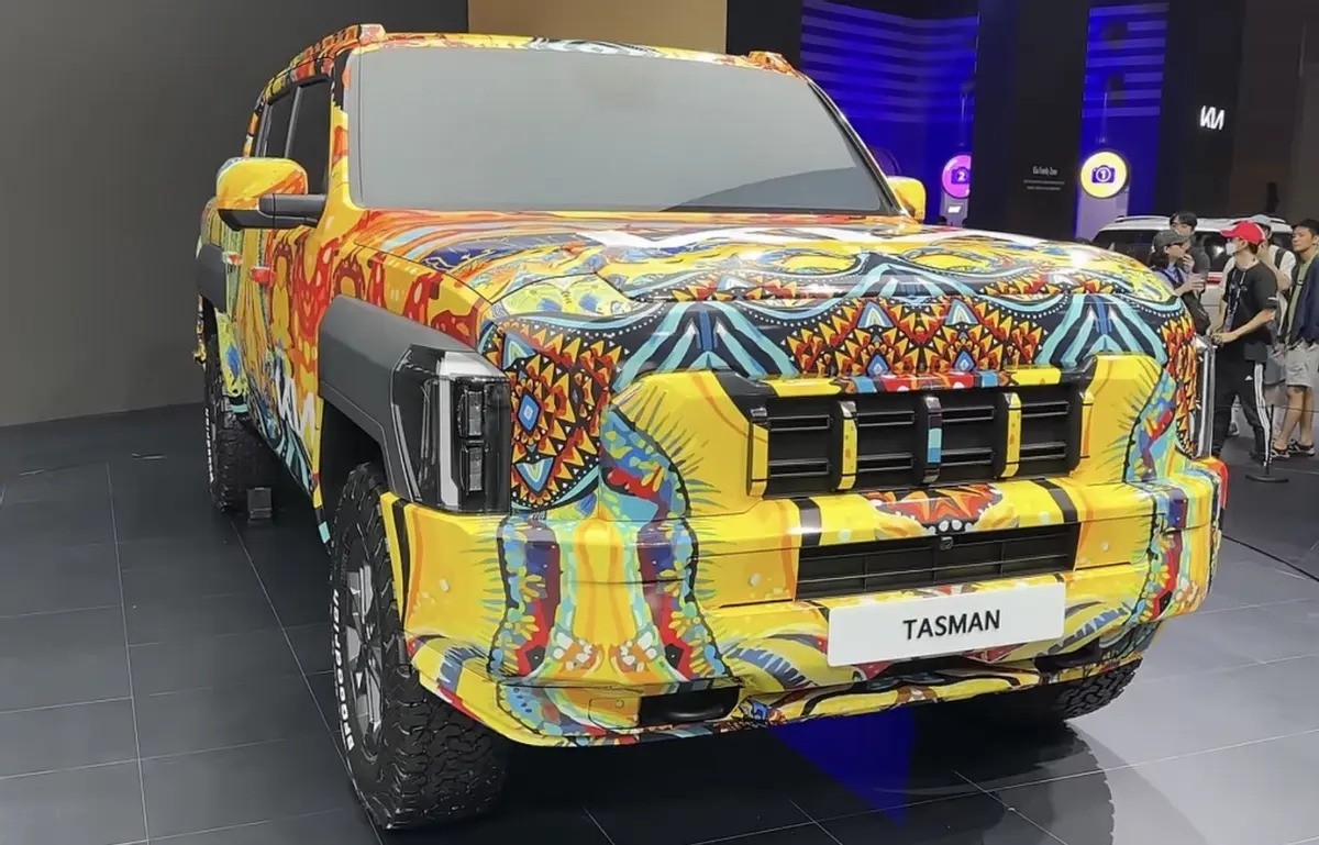外观方面,起亚Tasman展现出强烈的硬派风格,整体线条方正高大,宽大的方形轮拱霸气外露,彰显其越野与实用的双重特性。尽管车辆被艺术家Richard Boyd-Dunlop设计的独特伪装图案所覆盖,但刚毅的线条轮廓依然难以掩藏。这种伪装设计不仅增加了车辆的神秘感,还吸引了众多关注。