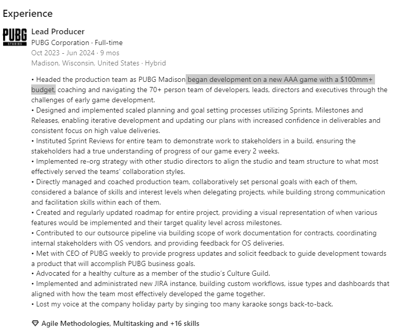 7月24日,刚从PUBG工作室离职的游戏制作人Flash Kowaleski在领英上透露,他将在2023年10月至2024年6月在KRAFTON担任一款全新3A游戏的首席制作人。这款游戏的开发预算约为7.28亿元人民币,由一支由开发者、主管、总监和高管组成的70多人团队负责。据悉,Flash Kowaleski在离职前曾领导这支团队并克服了早期游戏开发中的常见困难。