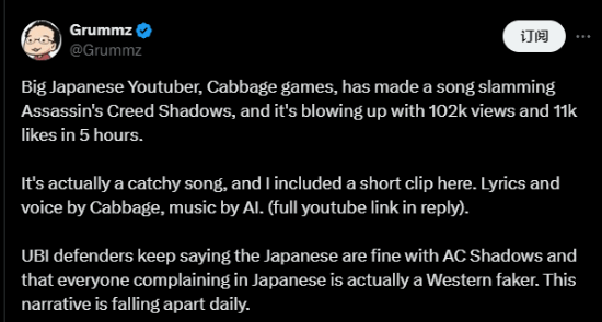 近期,一位知名创作者@DBC 创作了一首反讽抨击《刺客信条:影》的歌曲,该视频在短短24小时内就获得了超过20万次的观看和1.4万次点赞。据了解,这首歌曲的编曲部分是由人工智能创作而成,而歌词则是由作者本人亲自撰写并演唱。