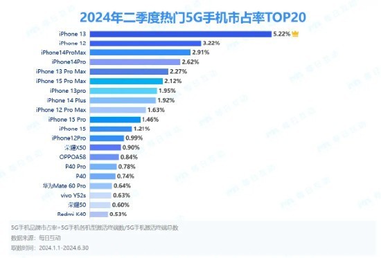 每日互动大数据发布了2024半年度热门5G智能手机市场占有率排行榜,比较意外的是,榜单几乎被iPhone霸榜,甚至还有三年前的产品上榜。TOP20中,前12名全部是iPhone,涵盖iPhone 12到iPhone 15多款机型。