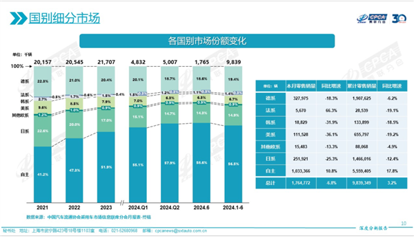 根据乘联会的最新销量数据显示,今年上半年德系品牌市场份额从去年的20.4%下滑至19.4%,日系品牌市场份额从17%下滑至14.9%,美系品牌市场份额从7.9%下滑至6.7%。然而自主品牌却在去年年底市场份额增长至51.9%,今年上半年增长至56.5%。
