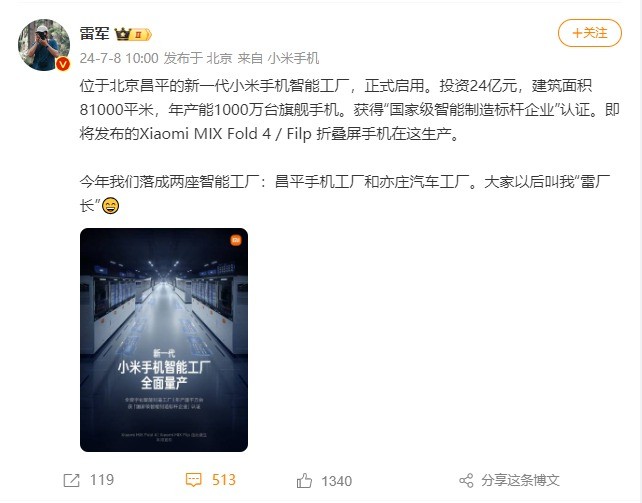 7月8日,小米创始人雷军宣布其位于北京昌平的新一代智能工厂正式启用。该工厂总投资额达到24亿元,建筑面积为81000平方米,年产能可达到1000万台旗舰手机。此外,该工厂还获得了“国家级智能制造标杆企业”的认证。