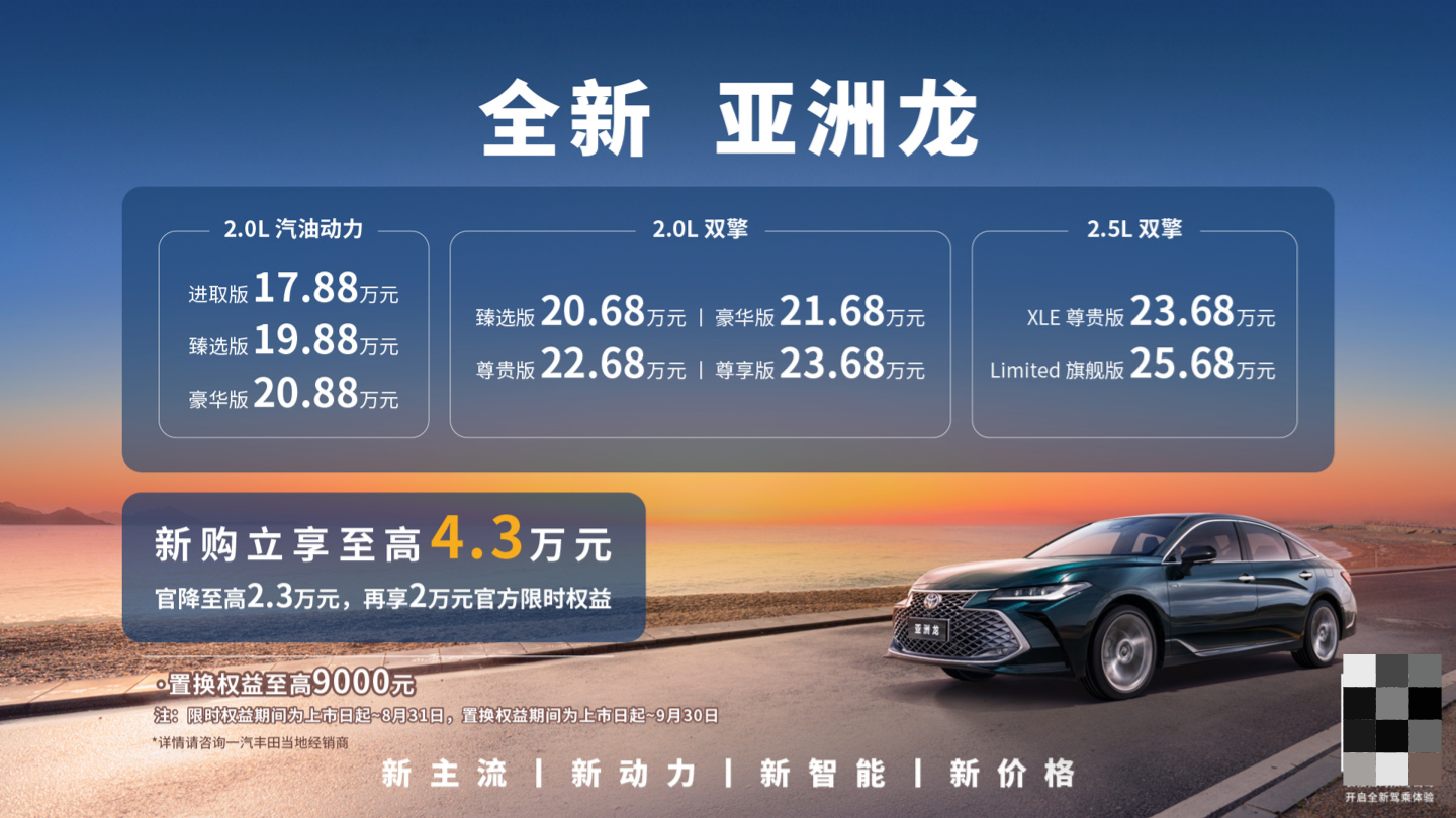 7月12日,一汽丰田新款亚洲龙正式上市。新车提供三种动力选择,包括2.0L汽油动力、2.0L双擎(混合动力)和2.5L双擎,共9款车型上市。其中,2.0L汽油动力车型售价从17.88万元起,而2.0L双擎车型售价则从20.68万元起;2.5L双擎车型售价则从23.68万元起。