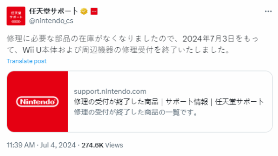 7月3日起,任天堂宣布停止Wii U主机和周边设备的维修服务。根据《Wii U维修服务条例》的规定,由于维修零件保留期已过,所有现存的零件已经耗尽,因此相关维修受理工作也同时终止。