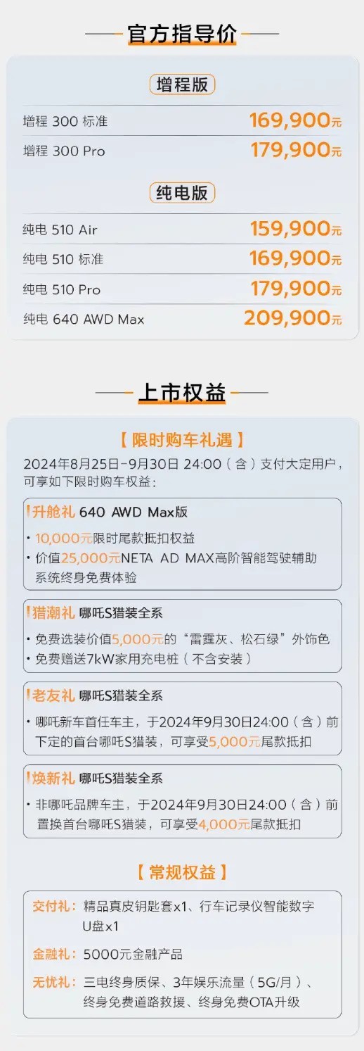 哪吒S猎装纯电版提供了单电机和双电机版本,其中单电机版本系统功率为200kW,双电机版本系统功率分别为370kW。电池方面,匹配了64.84kWh或91kWh的宁德时代神行长寿电池,在纯电续航上分别可达510公里或640公里。