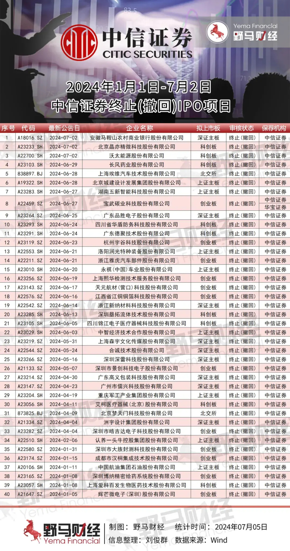 事实上,自2024年年初以来,据wind数据显示,中信证券担任保荐机构的IPO项目终止数量已高达40家,撤否率达40%。