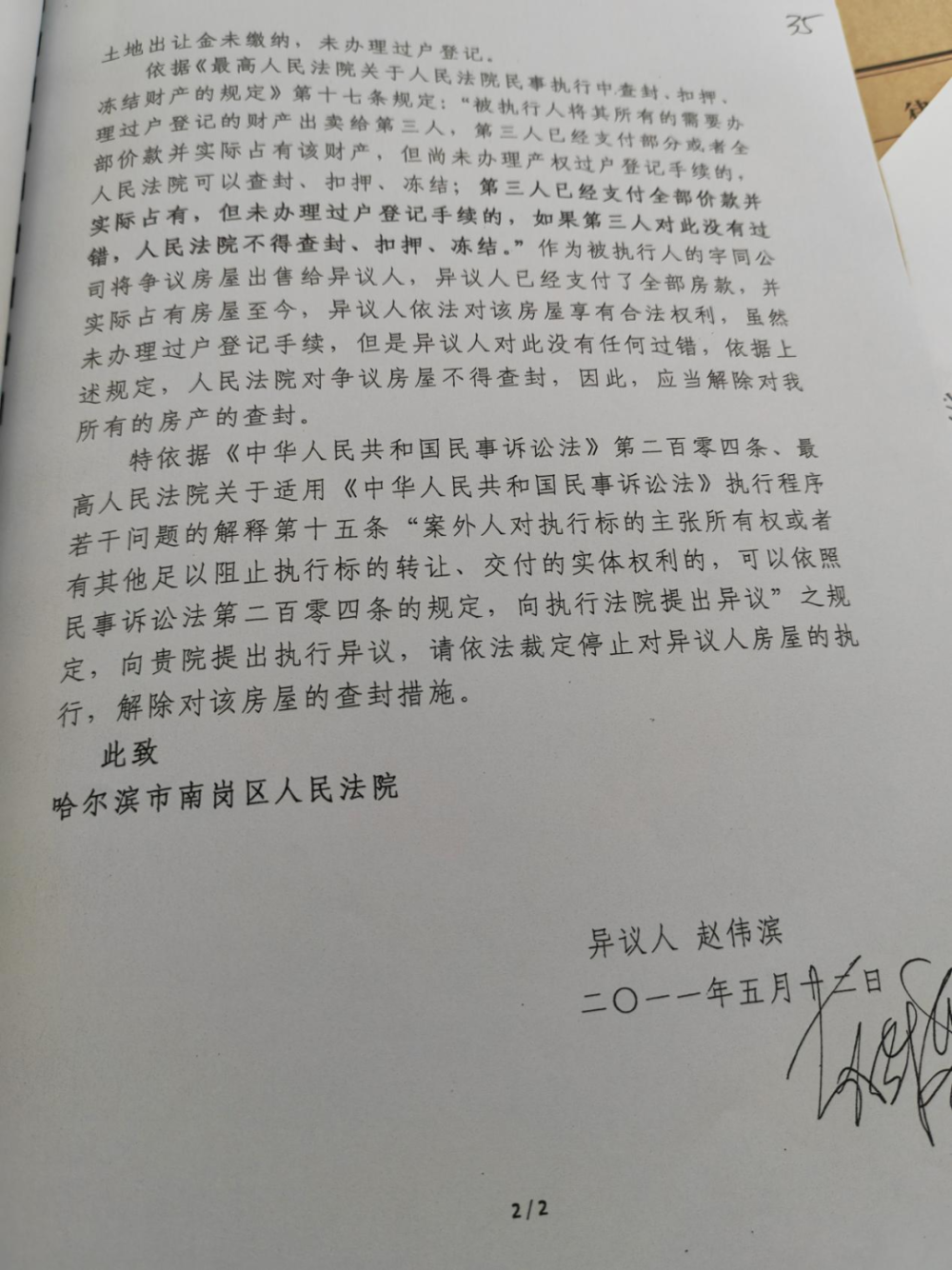 就在2024年5月16日,南岗区人民法院对赵伟滨提出的执行异议下发了执行裁定书。