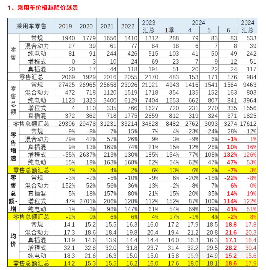 造成车市价格逐年上升的主要原因有混合动力和增程式汽车价格较高,从而形成了结构性拉动。原有的燃油车也出现了平均销售价格上涨的情况。燃油车高端化带动了价格上涨幅度较大。