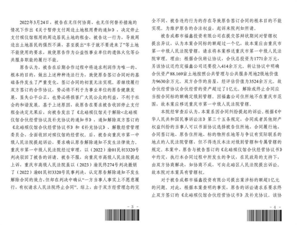 “拿到法院终审判决后,我们想继续履行协议进场开展工作,但多次找到北碚殡仪馆,都遭到了拒绝。”王先生称,北碚殡仪馆在重庆高院终审判决后,向北碚区人民法院提起诉讼,诉请终止双方签订的《合伙经营协议》及《补充协议》。成都福鑫公司则提出了管辖权异议,认为本案合同标的额超过1亿,应当由重庆一中院进行审理,但被驳回。