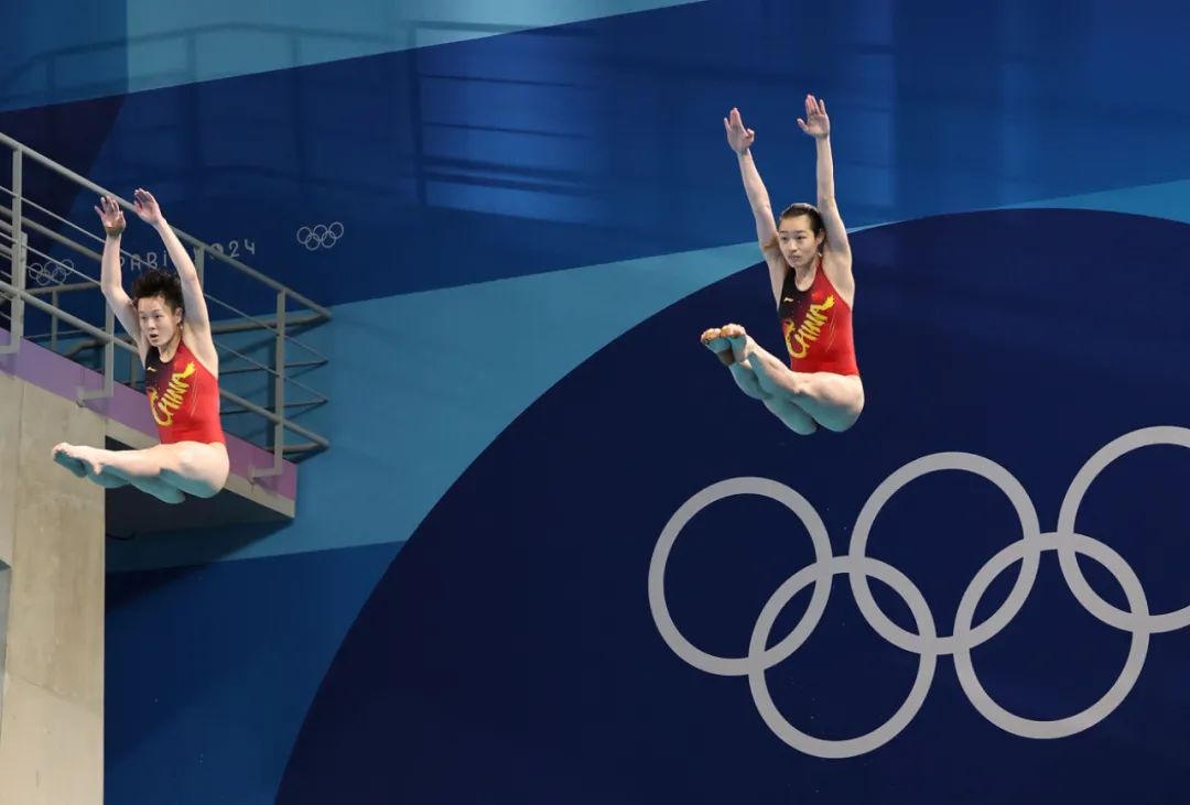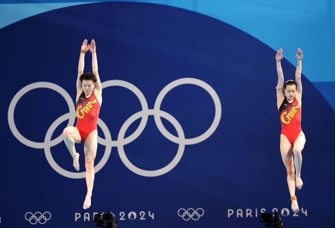 7月27日,中国选手昌雅妮(右)/陈艺文在比赛中。当日,在巴黎奥运会跳水女子双人3米板决赛中,中国选手昌雅妮/陈艺文夺得金牌。新华社记者 张玉薇 摄