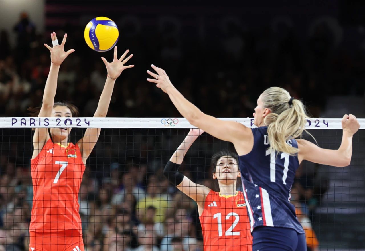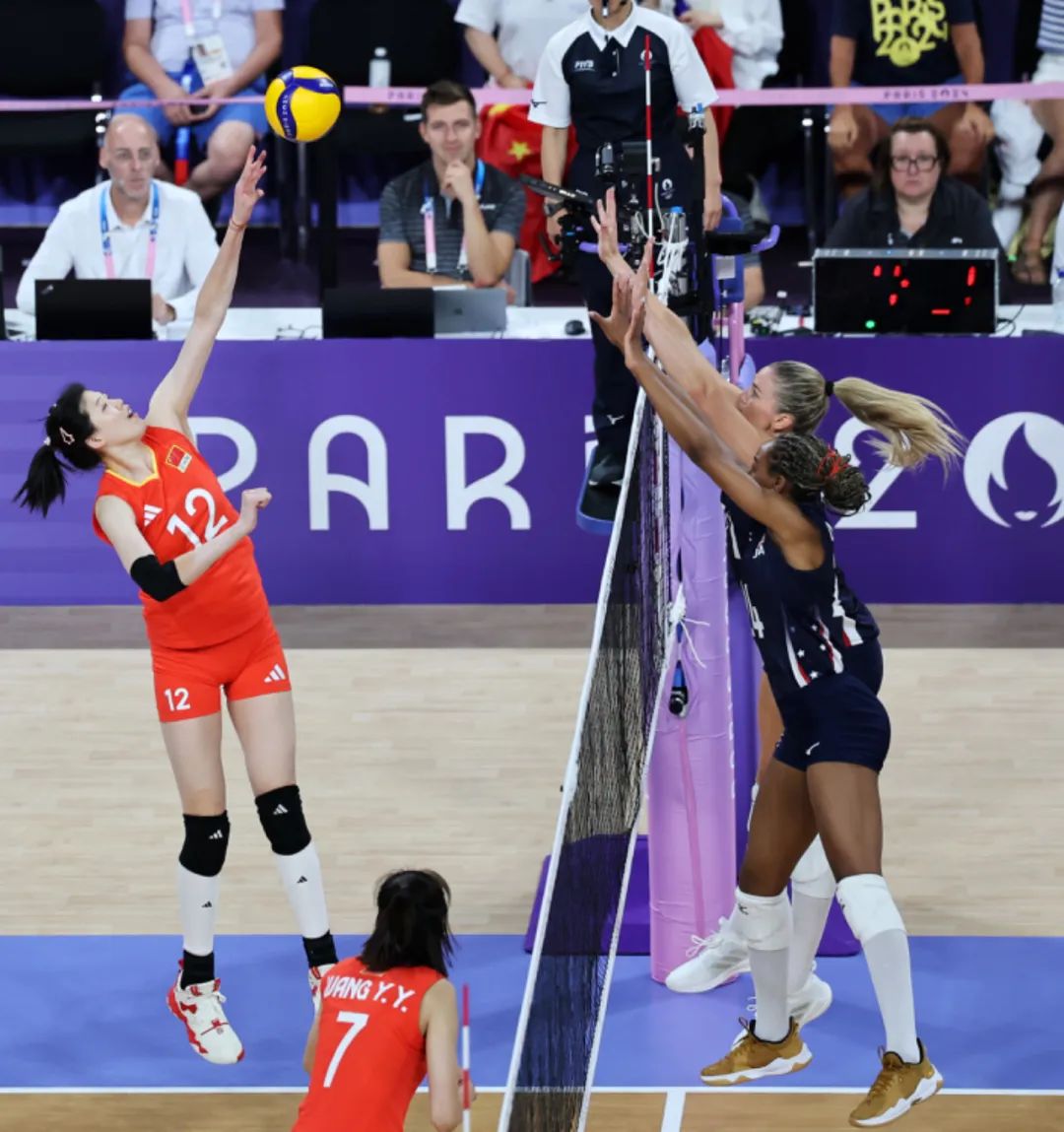 7月29日,中国队球员袁心玥(中左)、朱婷(中右)在比赛中。当日,在巴黎奥运会女子排球小组赛中,中国队对阵美国队。新华社记者 李钢 摄