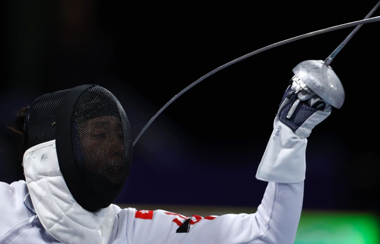 7月27日,中国香港选手江旻憓在八强赛中。最终,江旻憓15比7战胜乌克兰选手克里维茨卡。当日,巴黎奥运会击剑女子个人重剑比赛在巴黎大皇宫举行。新华社记者 费茂华 摄