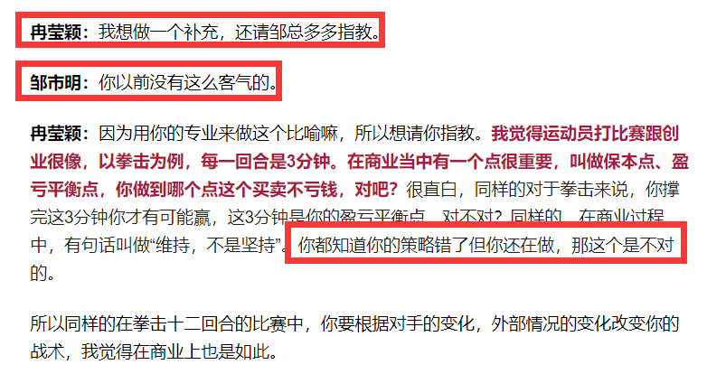 不愧是主持人,她用邹市明打拳比赛的进攻防守策略为例,说在商业上有句话叫做“维持,不是坚持”,如果自己的策略错了还要做,那这样就不对。