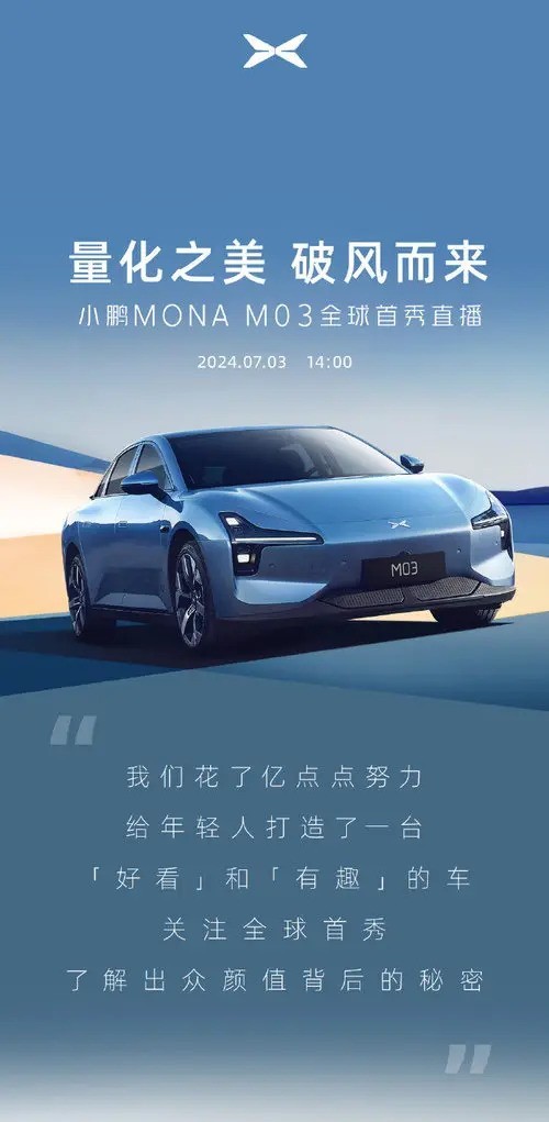 7月3日,小鹏MONA M03将首次亮相。这款新能源轿车定位年轻消费者群体,以其出色的外观和趣味性而闻名。车长4780mm,宽1896mm,高1445mm。其风阻系数低至Cd0.194,比小米SU7的Cd0.195更佳,堪称全球最低风阻的量产纯电掀背轿车。